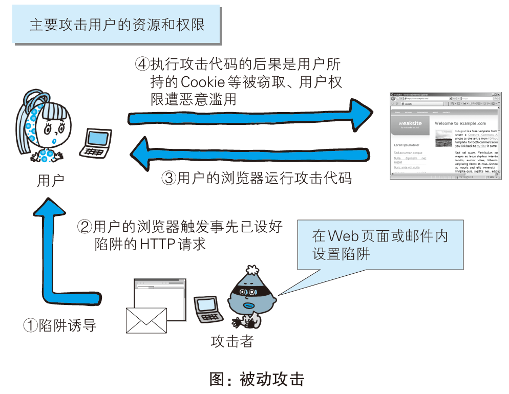- 执行完攻击代码,存在安全漏洞的 Web 应用会成为攻击者的跳板,可能导致用户所持的 Cookie 等个人信息被窃取,登录状态中的用户权限遭恶意滥用等后果。被动攻击模式中具有代表性的攻击是跨站脚本攻击(xss)和跨站点请求伪造(CSRF/XSRF)。