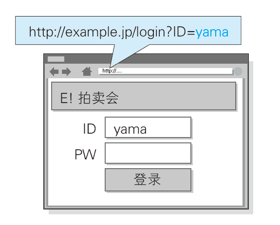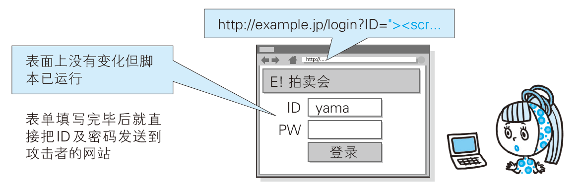 浏览器打开该 URI 后,直观感觉没有发生任何变化,但设置好的脚本却偷偷开始运行了。当用户在表单内输入 ID 和密码之后,就会直接发送到攻击者的网站(也就是 hackr.jp),导致个人登录信息被窃取。