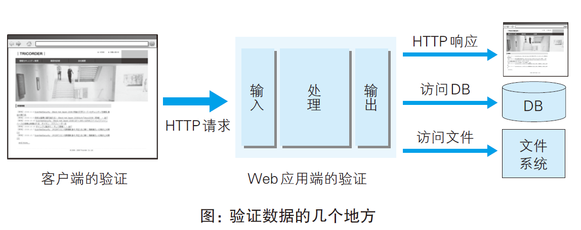 多数情况下采用 JavaScript 在客户端验证数据。可是在客户端允许篡改数据或关闭 JavaScript,不适合将 JavaScript 验证作为安全的防范对策。保留客户端验证只是为了尽早地辨识输入错误,起到提高 UI 体验的作用。 Web 应用端的输入值验证按 Web 应用内的处理则有可能被误认为是具有攻击性意义的代码。输入值验证通常是指检查是否是符合系统业务逻辑的数值或检查字符编码等预防对策。 从数据库或文件系统、HTML、邮件等输出 Web 应用处理的数据之际,针对输出做值转义处理是一项至关重要的安全策略。当输出值转义不完全时,会因触发攻击者传入的攻击代码,而给输出对象带来损害。