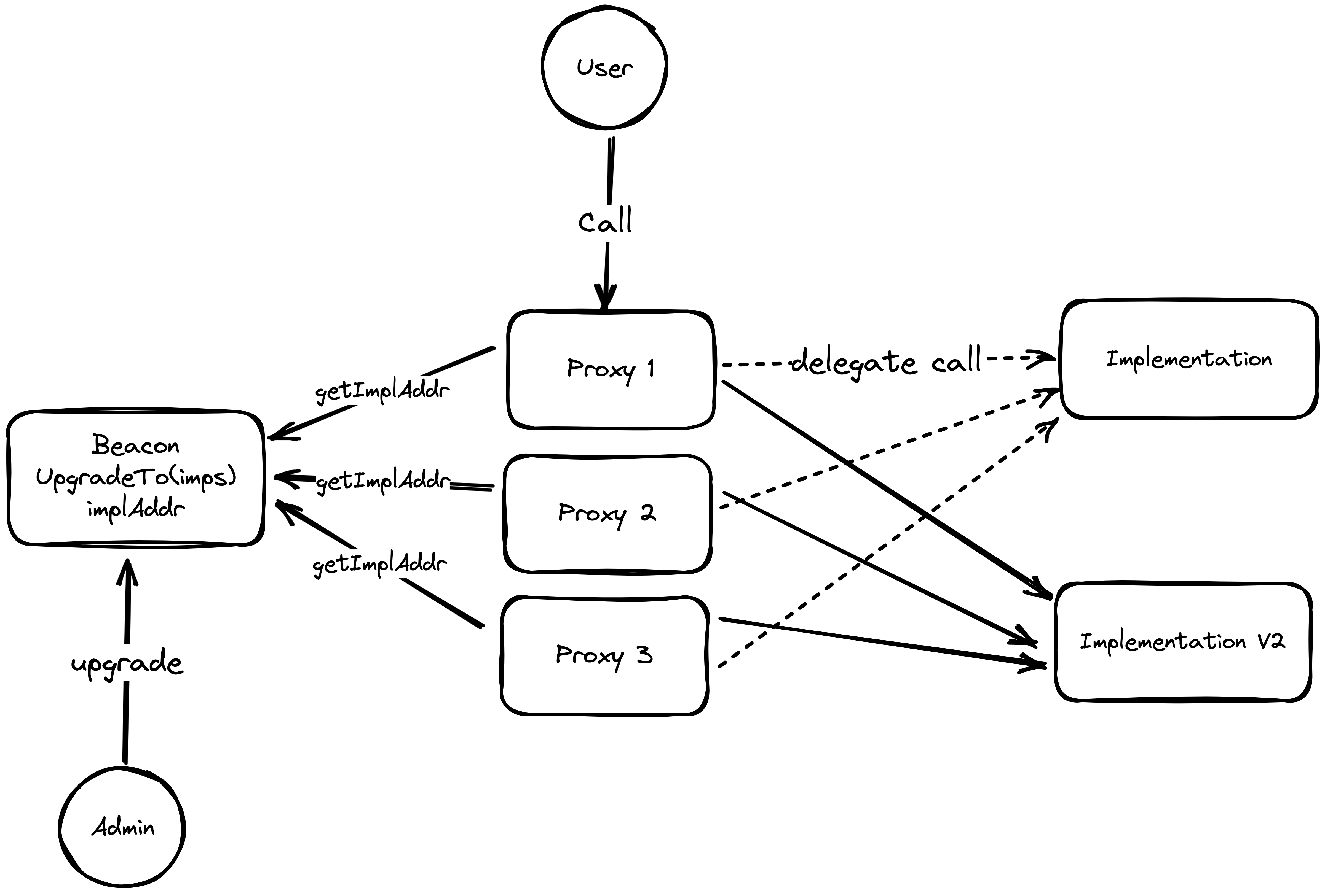 Beacon 模式是一种更加灵活的合约升级方式,实现方式是将 Implementation 地址存放在 Beacon 合约里,Proxy 合约中只保存 Beacon 合约的地址。在合约交互时,Proxy 合约需要先访问 Beacon 合约获取 Implementation 地址,然后再通过 delegatecall 调用 Implementation。