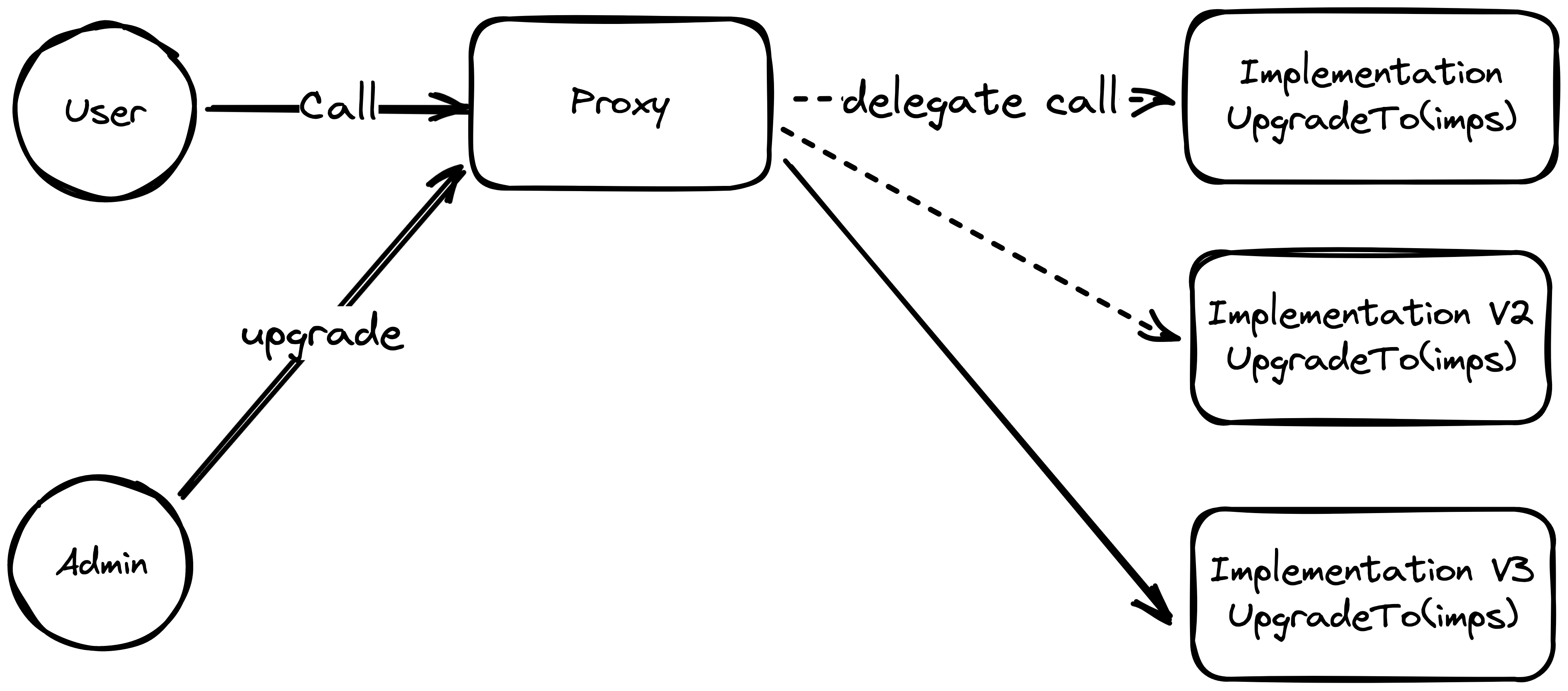 这种代理模式也称为通用可升级代理标准,相对于透明代理更加轻巧且通用,UUPS 的名称来自 EIP-1822,它首先记录了该模式。