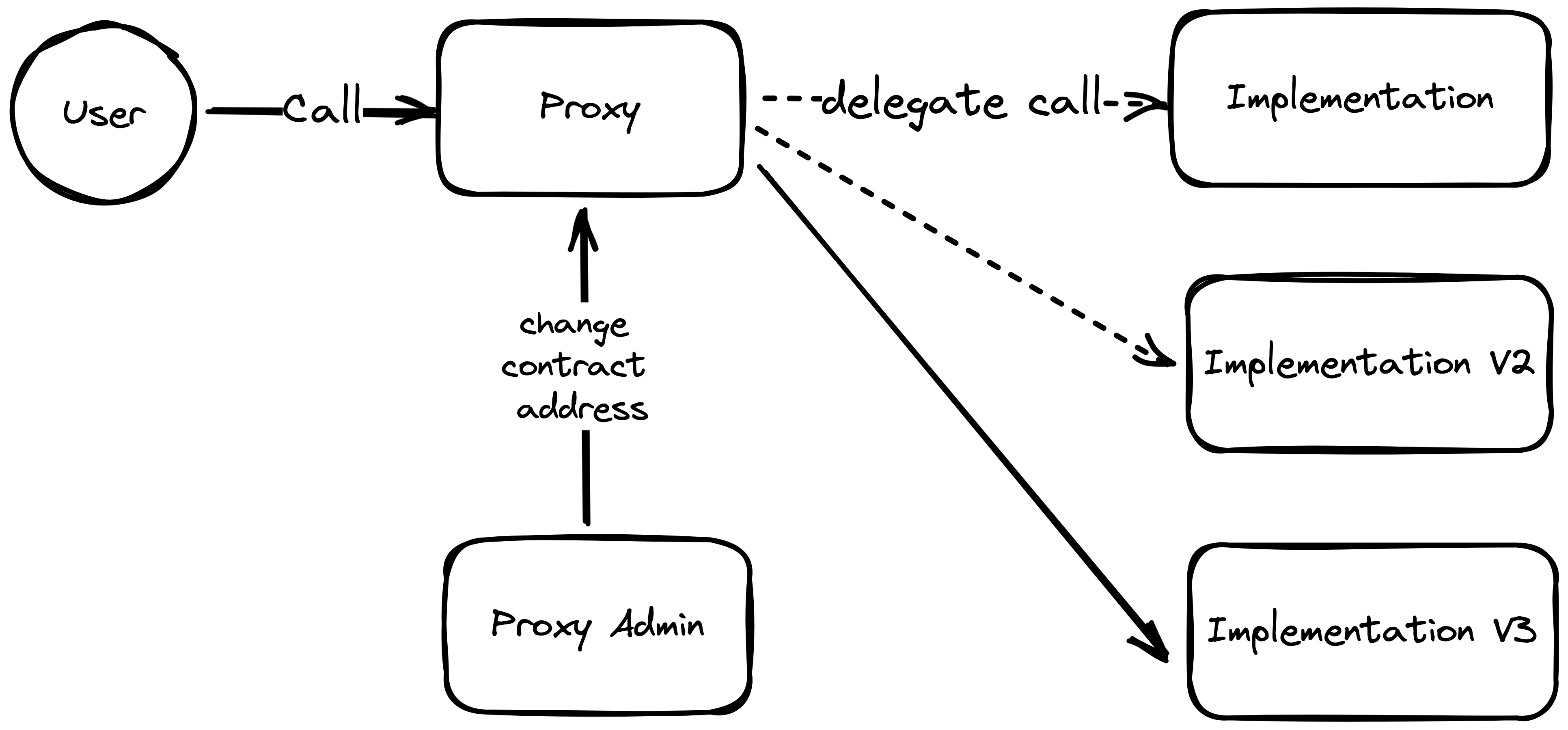 代理架构模式的原理是,所有的调用都会经过代理合约,重定向到最新部署的合约逻辑。如果想升级,只需部署新版本的合约,并更新代理以引用新的合约地址即可。
