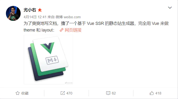 先简单介绍一下 VuePress,这是尤大在 2018 年 4 月份发布的一个新轮子。